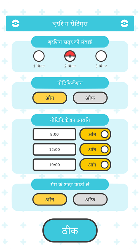 बच्चों व माता-पिता को ब्रश करना याद दिलाने के लिए, Pokémon Smile में रिमाइंडर नोटिफिकेशन सेट करने का विकल्प है। आप दिन में तीन नोटिफिकेशन सेट कर सकते हैं, जो दिन में किसी भी समय के लिए सेट हो सकता है। अपने बच्चे की उम्र और जरूरतों के अनुरूप ब्रशिंग समय एक से तीन मिनट के बीच एडजस्ट करें। आप तीन अलग प्रोफाइल भी बना सकते हैं, ताकि हर व्यक्ति अपनी प्रोफाइल से खेल सके।